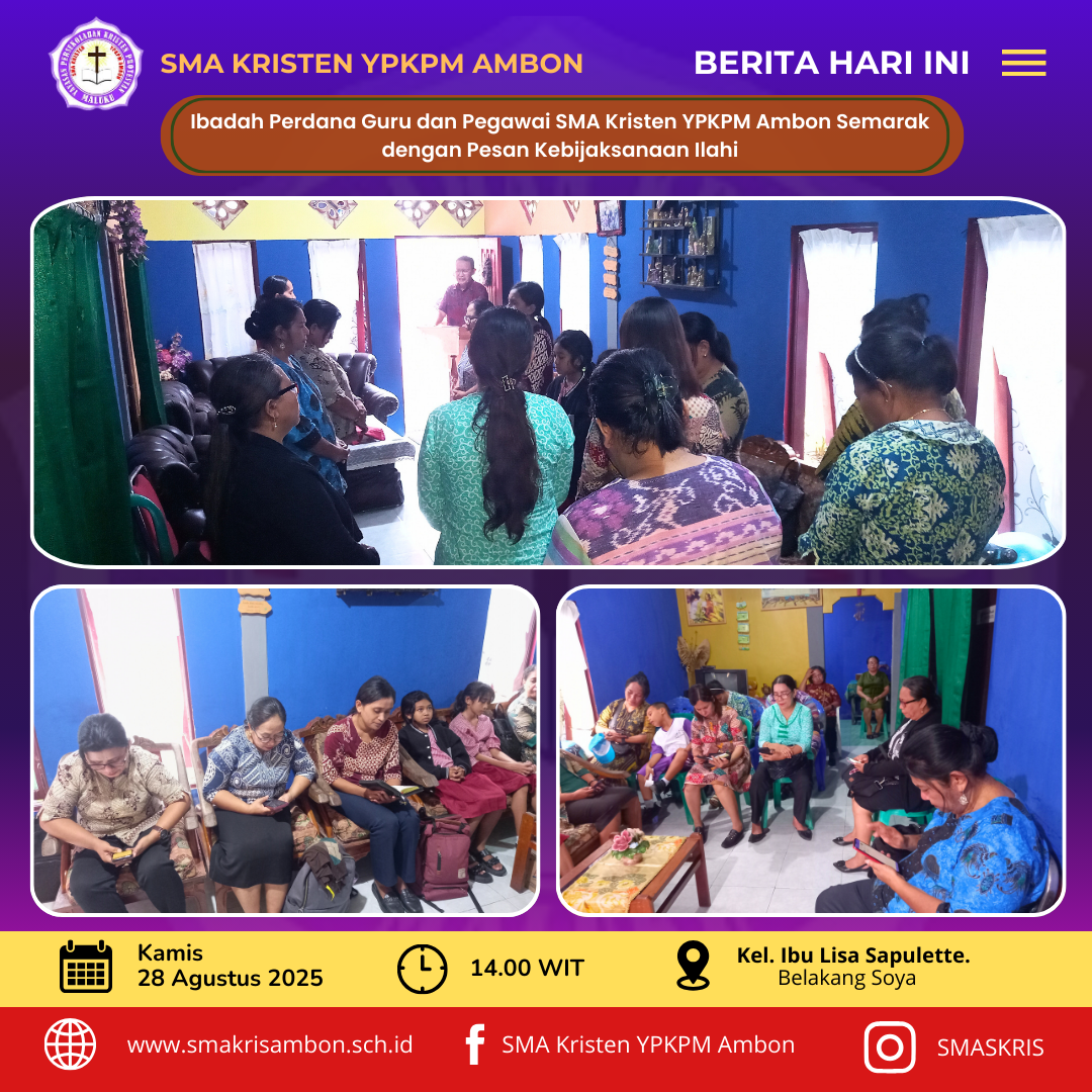 Ambon, 28 Agustus 2025– Menyambut semangat baru Tahun Ajaran 2025/2026, keluarga besar Guru dan Pegawai SMA Kristen YPKPM Ambon menggelar Ibadah Perdana yang berlangsung khidmat dan penuh kekeluargaan. Ibadah yang diselenggarakan di kediaman Keluarga Pattiwael/Sapulette (Ibu Lisa Sapulette) pada Kamis, 25 Agustus ini dipimpin langsung oleh Kepala Sekolah, Bapak Donald Wolter Dias, Hut.