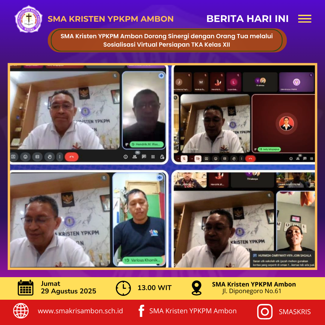 Pertemuan virtual ini berlangsung interaktif. Orang tua tidak hanya mendengarkan, tetapi juga aktif bertanya dan memberikan masukan. Respon yang muncul sangat positif—para orang tua berkomitmen untuk bersinergi dengan sekolah demi keberhasilan anak-anak mereka. Dengan dukungan penuh dari sekolah, orang tua, dan mitra bimbingan belajar, diharapkan siswa kelas XII SMA Kristen YPKPM Ambon bisa menghadapi TKA dengan lebih siap, tenang, dan meraih hasil terbaik.