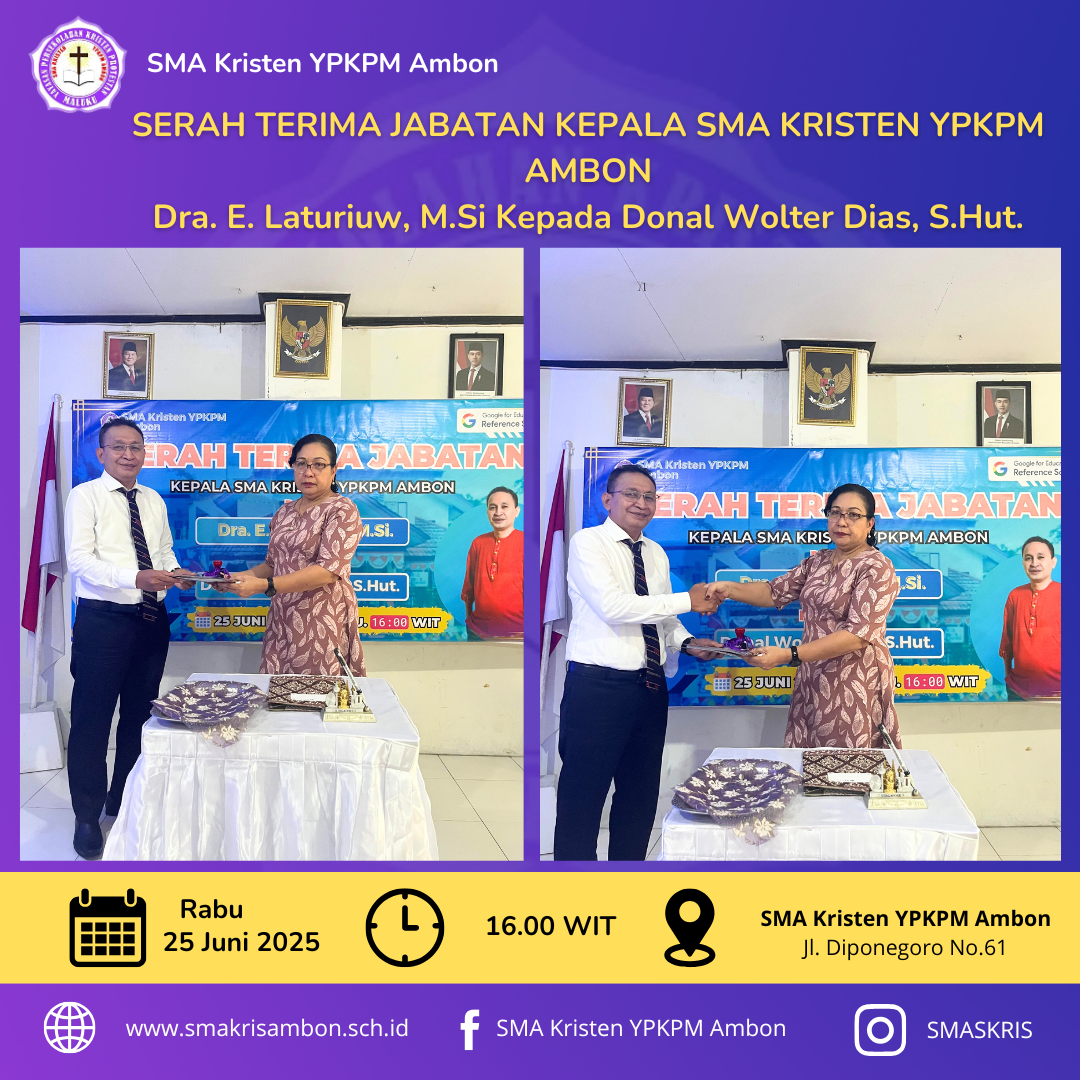 Prosesi serah terima jabatan ditandai dengan penyerahan Surat Keputusan (SK) dari Dra. E. Laturiuw, M.Si., kepada Donal Wolter Dias, S.Hut. Dalam sambutannya, kepala sekolah yang baru ini menyatakan komitmennya untuk melanjutkan visi-misi sekolah dengan semangat kolaborasi. "Saya bertekad membawa SMA Kristen YPKPM Ambon semakin maju, dengan dukungan seluruh civitas akademika," tegas Dias.